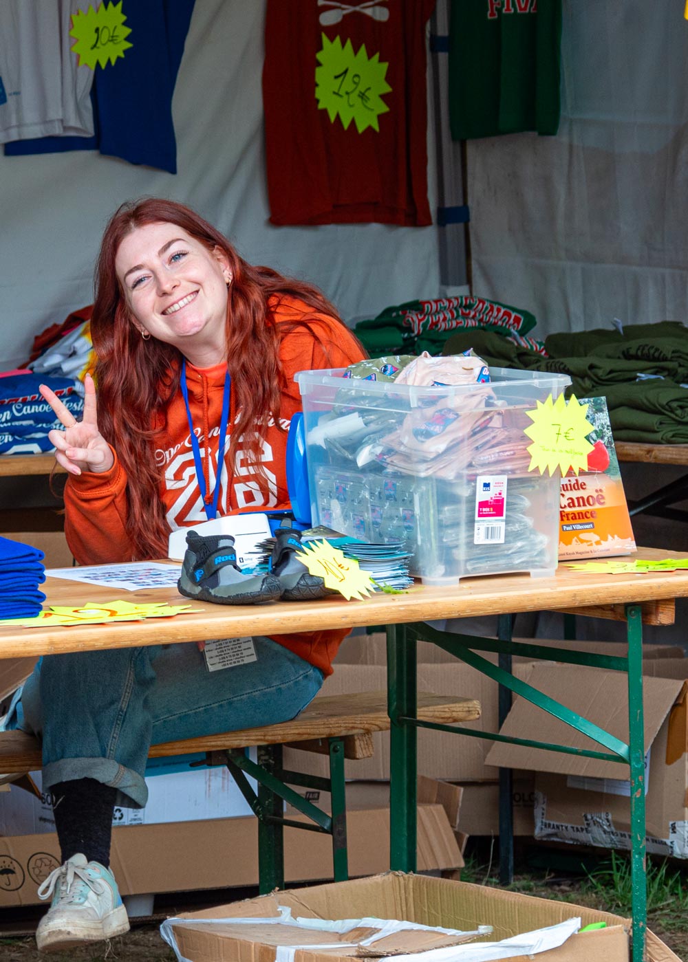 Lucie fait tourner la boutique de l’Open Canoe Festival, dont le succès est grandissant… et c’est en grande partie grâce à elle ! Sweat-shirts, T-shirts, bonnets, casquettes… La vente de tous ces produits nous aide à financer le Festival, ce qui n’est pas une mince affaire. Nous nous employons à créer de jolis graphismes et logos devenus légendaires, et Lucie fait souvent des miracles pour promouvoir tout ça !